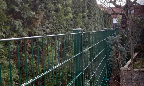 Doppelstabmatten schwer feuerverzinkt und grün beschichtet mit Pfosten 60 x 40 mit Abdeckleisten einbetoniert |