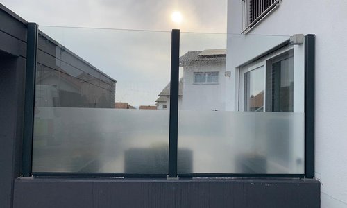 Glas Sichtschutz mit vierkant Aluminium-Nutpfosten mit Fussplatte |