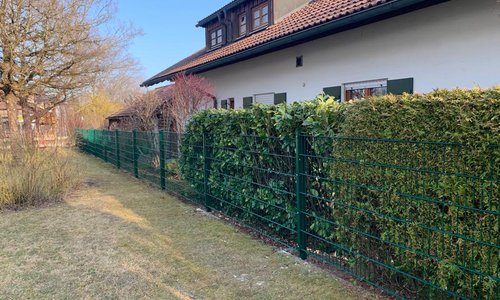 Doppelstabmatten schwer vorverzinkt und grün beschichtet mit Pfosten 60 x 40 mit Abdeckleisten einbetoniert |