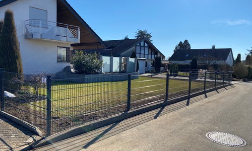 Doppelstabmatten schwer feuerverzinkt und anthrazit beschichtet mit Pfosten 60 x 40 mit Abdeckleisten einbetoniert |