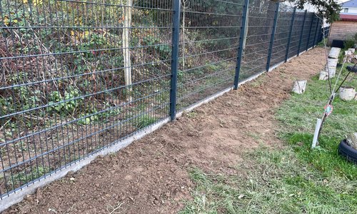 Doppelstabmatten schwer feuerverzinkt und anthrazit beschichtet mit Pfosten 60 x 40 mit Abdeckleisten einbetoniert |