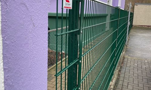 Doppelstabmatten schwer feuerverzinkt und grün beschichtet mit Pfosten 60 x 40 mit Abdeckleisten einbetoniert |