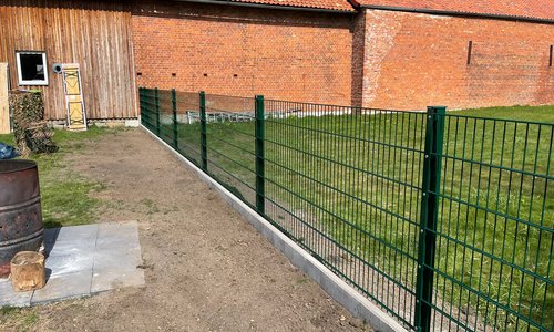 Doppelstabmatten schwer feuerverzinkt und grün beschichtet mit Pfosten 60 x 40 mit Abdeckleisten einbetoniert |