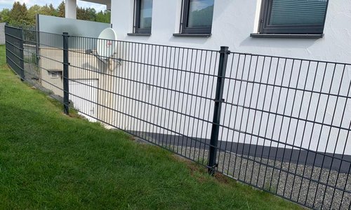 Doppelstabmatten schwer feuerverzinkt und anthrazit beschichtet mit Pfosten 60 x 40 mit Bügel einbetoniert |