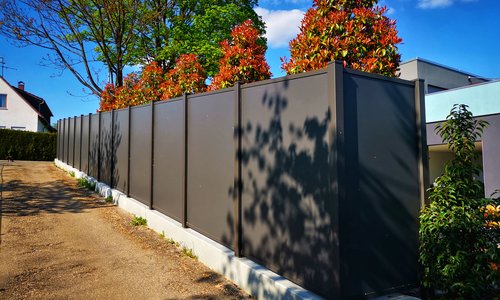 Ein individuell gestalteter,dem Gelände angepasster Sichschutzzaun aus Aluminiumpfosten mit einer HPL Füllung auf einer stark steigenden Betonmauer. Der Zaun wurde vor Ort an das Gelände angepasst und montiert. Die Beschichtung ist in RAL 7022 umbragrau und wurde auf Kundenwunsch so gefertigt. Die Füllung wurde aus hochwertigen witterungsbeständigen HPL Platten hergestellt.