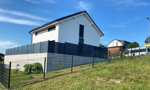 Doppelstabmatten schwer feuerverzinkt und anthrazit beschichtet mit Pfosten 60 x 40 mit Abdeckleisten einbetoniert |