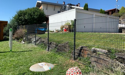 Doppelstabmatten schwer feuerverzinkt und anthrazit beschichtet mit Pfosten 60 x 40 mit Bügel einbetoniert |