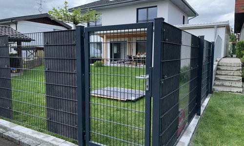 Doppelstabmatten schwer feuerverzinkt und anthrazit beschichtet mit Pfosten 60 x 40 mit Abdeckleisten einbetoniert |