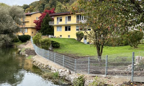 Doppelstabmatten leicht verzinkt mit Pfosten 40x60 verzinkt mit Abdeckleisten einbetoniert |