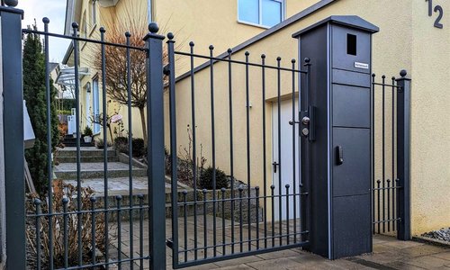 Dieser Eingangsbereich wurde mit einem Klassikzaun inkl. Eingangstor und Techniksäule, welche Platz für Klingelanlage, Briefkasten und Paketfach bietet, von der Straße abgetrennt. So sind die Besucher angehalten, sich vorne an dem Tor über die Klingel anzumelden, ohne das Grundstück betreten zu müssen. Für die Paketzustellung ist ein Paketfach integriert, welches durch ein Zahlencodeschloss gesichert ist. Sowohl Pakete, als auch Briefe können bequem von innen entnommen werden.