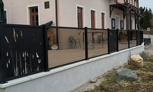 Glas Sichtschutz mit vierkant Aluminium-Nutpfosten mit Fussplatte |
