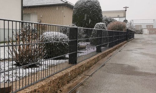Doppelstabmatten schwer vorverzinkt und anthrazit beschichtet mit Pfosten 60 x 40 mit Abdeckleisten einbetoniert |