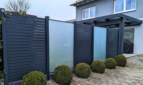 Ein hochwertiger Aluminium- und Glassichtschutz schützt vor neugierigen Blicken in den Garten. Unterhalb des Sichtschutzzauns wurden Betonrabatten als Abgrenzung des Gartens zur Einfahrt einbetoniert.