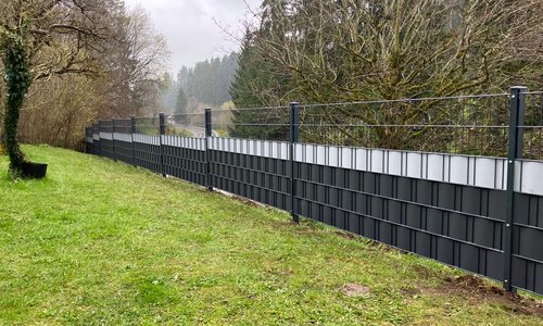 Doppelstabmattenzaun mit teilweise eingeflochtenen Sichtschutzstreifen
