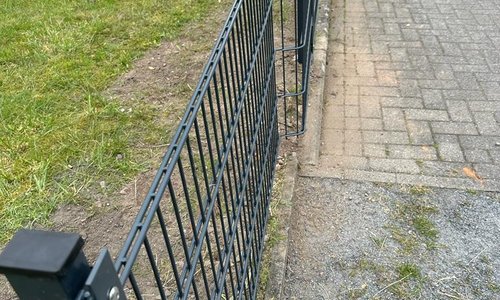 Doppelstabmatten schwer feuerverzinkt und anthrazit beschichtet mit Pfosten 60 x 40 mit Abdeckleisten einbetoniert |