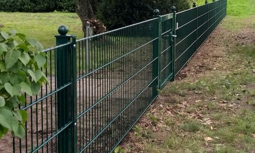Doppelstabmatten leicht vorverzinkt und grün beschichtet mit Pfosten 60 x 40 mit Abdeckleisten einbetoniert |