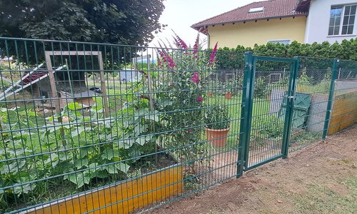 Doppelstabmatten schwer vorverzinkt und grün beschichtet mit Pfosten Vario einbetoniert |