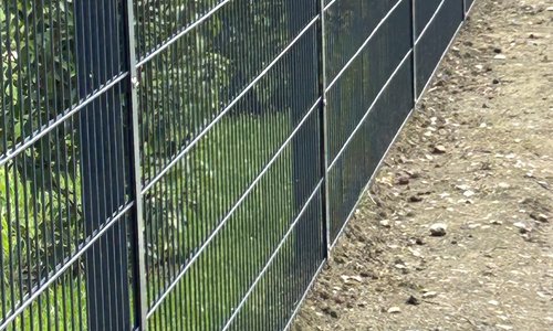 Doppelstabmatten schwer vorverzinkt und anthrazit beschichtet mit Pfosten 60 x 40 mit Abdeckleisten einbetoniert |