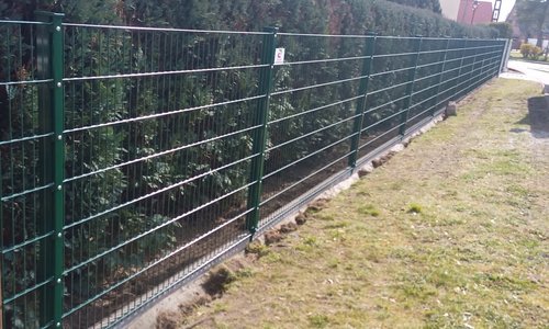 Doppelstabmatten leicht vorverzinkt und grün beschichtet mit Pfosten 40x60 mit Abdeckleisten in Aussparung |