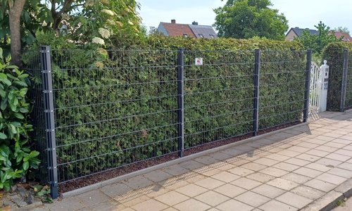 Doppelstabmatten leicht vorverzinkt und anthrazit beschichtet mit Pfosten 60 x 40 mit Abdeckleisten einbetoniert |