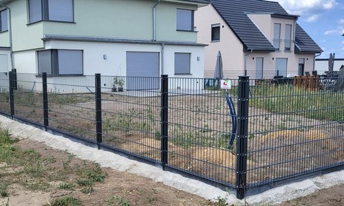 Doppelstabmatten leicht vorverzinkt und anthrazit beschichtet mit Pfosten 60 x 40 mit Abdeckleisten einbetoniert |