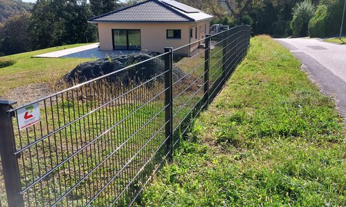 Doppelstabmatten leicht vorverzinkt und anthrazit beschichtet mit Pfosten 60 x 40 mit Abdeckleisten einbetoniert |