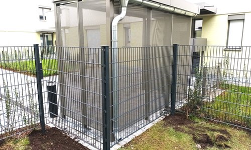 Doppelstabmatten schwer feuerverzinkt und anthrazit beschichtet mit Pfosten 60 x 40 mit Abdeckleisten einbetoniert |