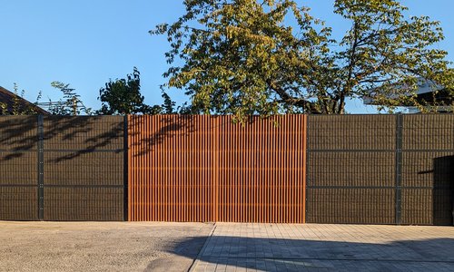 Hier ist ein 3m hoher Schallschutzzaun zur benachbarten Tankstelle entstanden. Zusätzlich wurde eine Holzverkleidung angebracht.