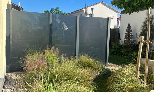 Glas Sichtschutz mit vierkant Aluminium-Nutpfosten einbetoniert |