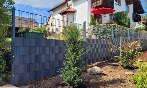 Doppelstabmatten schwer feuerverzinkt und anthrazit beschichtet mit Pfosten 60 x 40 mit Abdeckleisten einbetoniert |