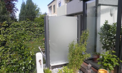 Glas Sichtschutz mit vierkant Aluminium-Klemmpfosten einbetoniert |