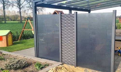 Fence type: | Glas Sichtschutz mit vierkant Aluminium-Nutpfosten einbetoniert |