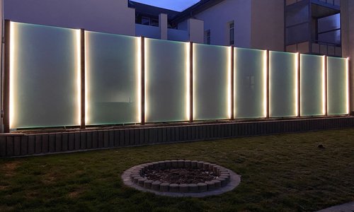 Glas Sichtschutz mit vierkant Aluminium-Klemmpfosten einbetoniert |