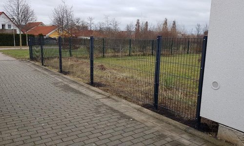 Doppelstabmatten leicht vorverzinkt und anthrazit beschichtet mit Pfosten 60 x 40 mit Abdeckleisten einbetoniert |