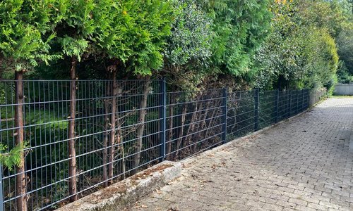 Doppelstabmatten schwer feuerverzinkt und anthrazit beschichtet mit Pfosten 60 x 40 mit Abdeckleisten einbetoniert |
