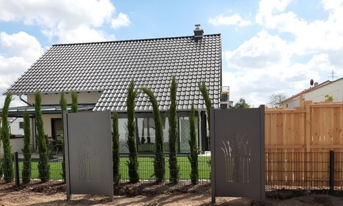 Doppelstabmattenzaun mit Holz- und Design-Sichtschutzelementen |