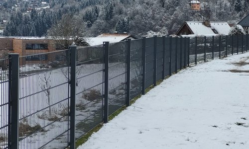 Doppelstabmatten schwer feuerverzinkt und anthrazit beschichtet mit Pfosten 60 x 40 mit Abdeckleisten einbetoniert |