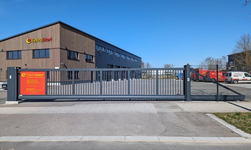 Hier wurde bei der Firma Elektro Erkert ein zehn Meter langes freitragendes Schiebetor in der Hofeinfahrt installiert, das in Verbindung mit einem Doppelstabmattenzaun zuverlässig für die Sicherheit des Firmengeländes sorgt.