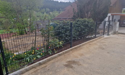 Doppelstabmatten leicht vorverzinkt und anthrazit beschichtet mit Pfosten 60 x 40 mit Abdeckleisten einbetoniert |