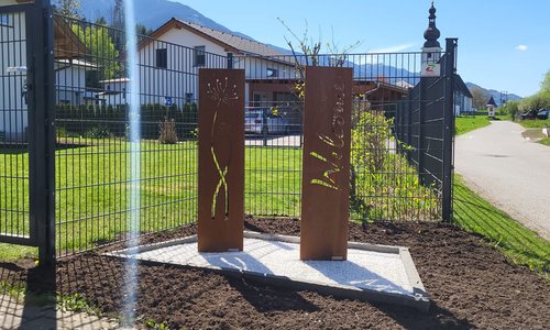 Cortenstahl Motivstele/Doppelstabmattenzaun |