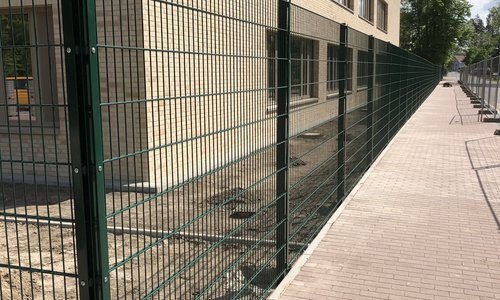 Doppelstabmatten schwer feuerverzinkt und grün beschichtet mit Pfosten 60 x 40 mit Abdeckleisten einbetoniert |