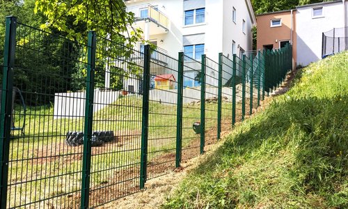 Doppelstabmatten schwer feuerverzinkt und grün beschichtet mit Pfosten 60 x 40 mit Abdeckleisten einbetoniert |