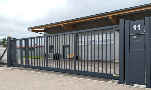 Zur Sicherheit und Abgrenzung des Firmengeländes wurde hier ein freitragendes, zwei Meter hohes Schiebetor mit Quadratstabfüllung in anthrazit errichtet. Abgerundet wird das Schiebetor mit sieben Meter Durchfahrt durch die Kombination mit einem farblich und höhenmäßig passenden Doppelstabmattenzaun und einer modernen Briefkastensäule inklusive Sprechanlage.