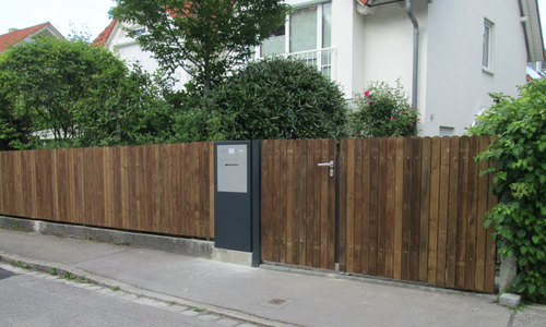 Staketen Holz vor die Pfosten / T-Stahl Pfosten verzinkt mit Fussplatte |