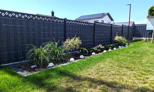 Hier wurde zur Grundstücksabgrenzung und für mehr Privatsphäre im Garten ein schlichter und moderner Sichtschutz aus Doppelstabmatten und Flechtfix errichtet. Durch die Stufung des Zauns und den oberen Dekor-Sichtschutzstreifen, Motiv Karo-Tape, wirkt der Zaun schick und verspielt, aber trotzdem schlicht.