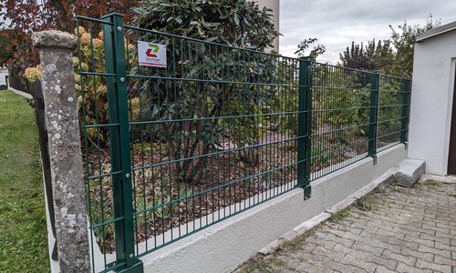 Fence type: | Doppelstabmatten leicht feuerverzinkt und grün beschichtet mit Pfosten 60 x 40 mit Abdeckleistenmit Fussplatte |