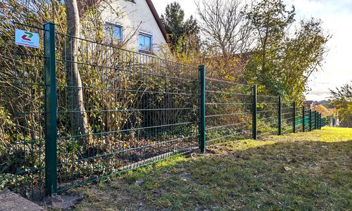 Zur Grundstücksabgrenzung wurde hier ein dem Gelände entsprechend stufiger, grün beschichteter und 120cm hoher Doppelstabmattenzaun montiert.