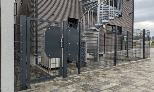 Als Durchgang von innen nach außen wurde hier ein 160cm hohes und 100cm breites, einflügeliges VARIO-Tor mit Doppelstabmattenfüllung, farblich passendem aufschraubbarem Durchgreifschutz und Panikschloss montiert.