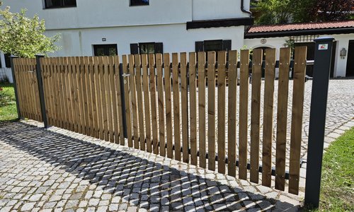 Dreiflügelige Toranlage, Rahmentor zweiflügelig und einflügelig mit aufgeschraubten Zaunlatten