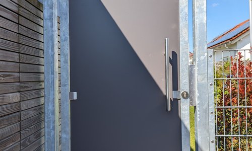 Ein schlichtes und modernes, 180cm hohes Tor mit feuerverzinktem Rahmen und undurchsichtiger Füllplatte bietet Sichtschutz und gleichzeitig einen praktischen und abschließbaren Durchgang im Gartenzaun.